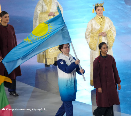 Барлық құраманың ту ұстаушылары делегациялардан бөлек жүріп өтті. Қазақстан Республикасының Мемлекеттік туын Италияда алтын медаль жеңіп алған мәнерлеп сырғанаушы Михаил Шайдоров алып шықты.