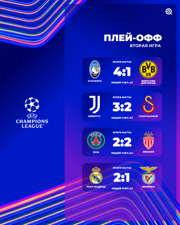 25 февраля состоялись вторые матчи 1/16 финала Лиги Чемпионов УЕФА, где в следующий этап прошли Аталанта, ПСЖ, Реал Мадрид и Галатасарай!