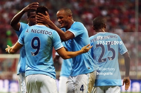 Футболисты «Манчестер Сити» провели свой первый полуфинал очень якро, отправив в ворота «Милана» за первый тайм пять мячей. Правда, затем англичане немного расслабились, позволив россонери значительно сократить отставание в счете. Несмотря на это, подопечные Мануэля Пеллегрини удержали преимущество в два мяча и получили возможность побороться за звание победителя Audi Cup.
