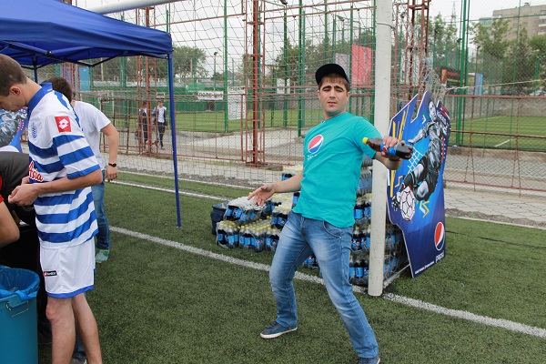 Так, для самых юных болельщиков сотрудники компании привезли несколько комплектов игры "Настольный футбол", всем желающим рисовали эмблему "Пепси", в перерыве матчей проходил конкурс "Бармен-шоу", в котором работники сервиса показали высший пилотаж, которого не каждый заправский бармен сможет добиться.