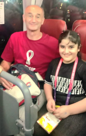Если в первые дни ощущалась напряжённость в общении с местными жителями, то сейчас с этим нет никаких вопросов. Видя мой аккредитационный бейдж, люди интересуются из какой я страны, сами охотно знакомятся и просят фото на память. Один из таких эпизодов со мной произошёл в автобусе. На одной из остановок в салон зашла большая семья и одну из девчонок заинтересовал мой бейдж. Она о чем-то прошепталась с мамой, чьё лицо скрывала паранджа. Мама направилась ко мне и попросила фото на память. Я с удовольствием согласился и перед съёмкой дал свой аккредитационный документ девочке, рассказав о том, что я журналист из Казахстана. Фотографировала мама. Усаживая свое чадо рядом с иностранцем, сообщила, что они живут в Катаре, а вся их семья - муж и три дочки из Палестины. Самая младшая проявила любопытство.