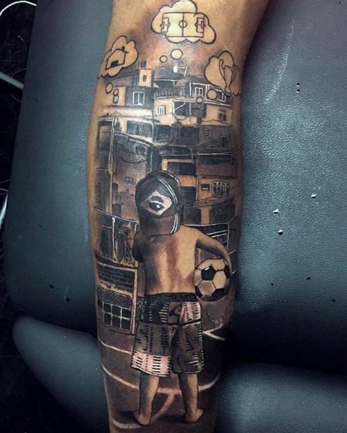Новейшая татуировка, сделанная 7 декабря, рассказывает о мальчике, мечтающем о собственном доме, футболе и Лиге чемпионов. «Это молодой Неймар, он вспоминает о фавеле, где рос, о своих корнях. И как с годами это осталось позади», – сообщил тату мастер Мигель Боигес.