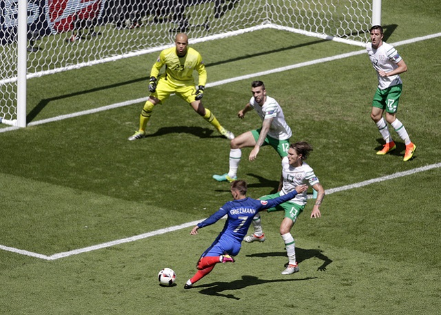 Когда казалось, что французы устали и главное для "Зеленой армии – не упустить нити игры, оборона ирландцев упускает в своей штрафной Гризманна. 1:1!!!