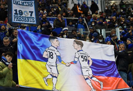 Болельщики клуба из Бергамо перед матчем с «Байером» в Лиге Европы вывесили баннер, на котором футболисты пожимают друг другу руки на фоне российского и украинского флагов.