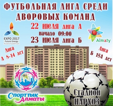22-23 июля, на стадионе университета "Нархоз" пройдет футбольная лига среди дворовых команд в рамках программы "Спорттық Алматы". Эти турниры станут одиннадцатыми в этом году.