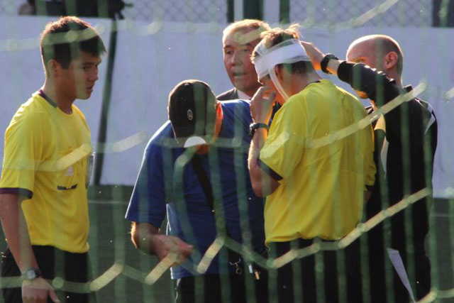 – В первом тайме, примерно на 25-й минуте игры, резервный судья Александр Павлов направился к мальчишкам, подающим мячи, чтобы сделать замечание, – рассказывает болельщик кайратовцев. – Приструнив юных футболистов, он побежал на свое место к центру. Но передвигался не в коридоре между солдатами и трибунами, а вдоль бровки, почти по боковой линии. В это же самое время пошла атака гостей на ворота "академиков", и помощник главного судьи Дмитрий Хасап, как и положено, помчался в том же направлении и… навстречу своему коллеге. Где-то в районе середины боковой линии половины поля их пути пересеклись, и двое рефери на большой скорости столкнулись лбами.