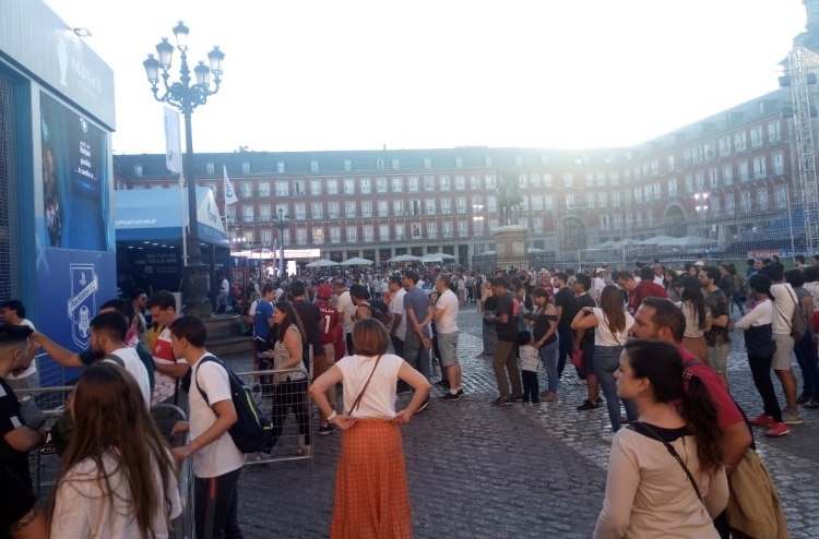На Пласа-Майор установлен гигантский круглый экран, на котором болельщики вновь смакуют величайшие моменты истории Лиги чемпионов.