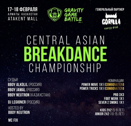 17-18 февраля в ТРЦ "Atakent Mall" при поддержке общественной организации "Я Алматинец" впервые пройдет Центрально-Азиатский Чемпионат по брейкдансу - Gravity Game Battle Volume 1 (GGB Vol. 1).