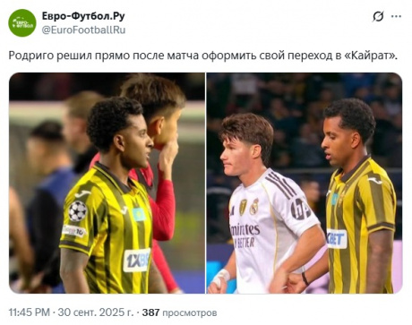 Официальный аккаунт Лиги чемпионов УЕФА опубликовал видео с форвардом мадридского "Реала" Родриго в футболке алматинского "Кайрата". Ролик набрал 19 миллионов просмотров менее чем за сутки, передаёт Tengri Sport.