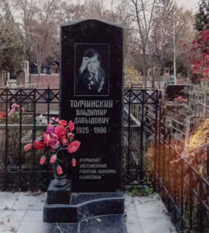 Участник Великой Отечественной войны, кавалер боевых наград Владимир Давидович Толчинский умер на 72-м году жизни и похоронен на Центральном городском кладбище Алматы.