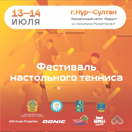 13-14 июля раскаточный каток «Барыс» (г. Нур-Султан) принимает на своей просторной площадке участников традиционного Фестиваля настольного тенниса, приуроченного к Дню столицы.